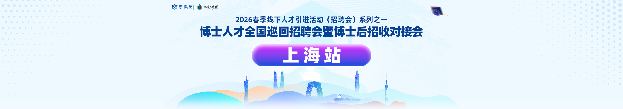 2026“十五五”开局之年,国家战略人才力量建设进入关键窗口期。高校人才网深耕学术科技人才引智领域八载,累计举办博士巡回招聘会100+场,已成为连接海内外青年英才与用人单位的重要桥梁。2026年春季,我们精选成都、哈尔滨、北京、上海、武汉、广州6大人才高地,旨在为用人单位一站式锁定“应届博士、准博士后、往届优秀博士、出站博士后及在职人才”等高素质青年人才,助力抢占“十五五”开局引智先机。